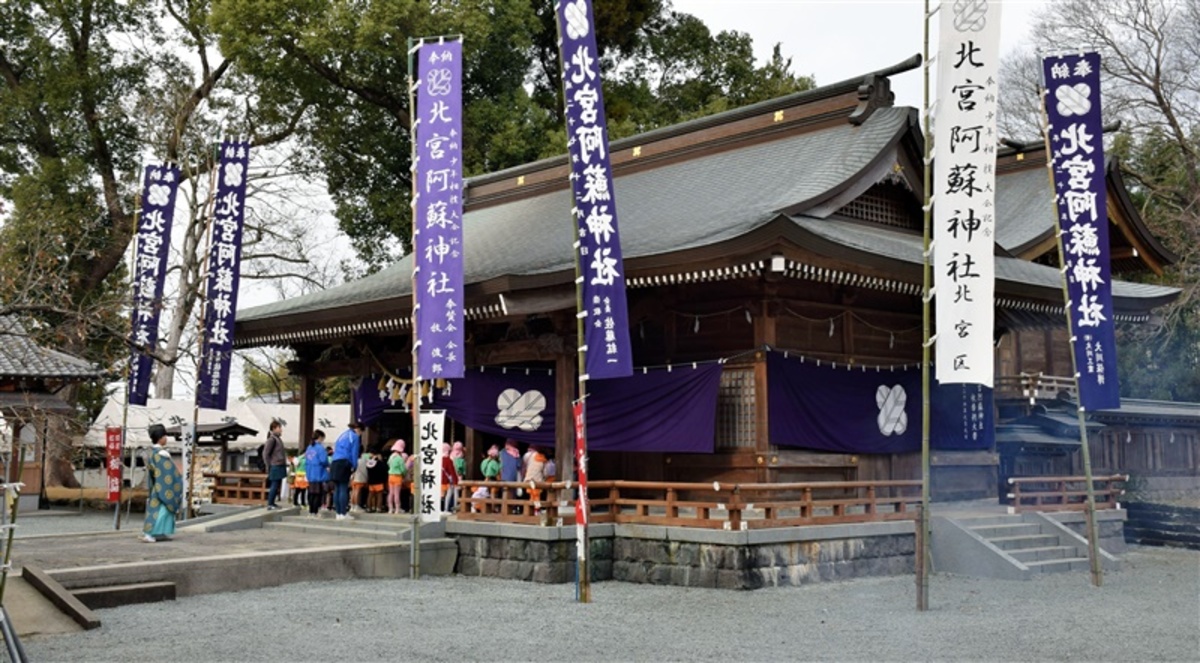 スタンプラリーのポイントの一つとなっているのは、菊池一族ゆかりの北宮阿蘇神社です。南北朝時代に九州の南朝方を支えた豪族である菊池一族や、征西将軍・懐良親王に縁のあるゆかりの地を巡る企画となっています。