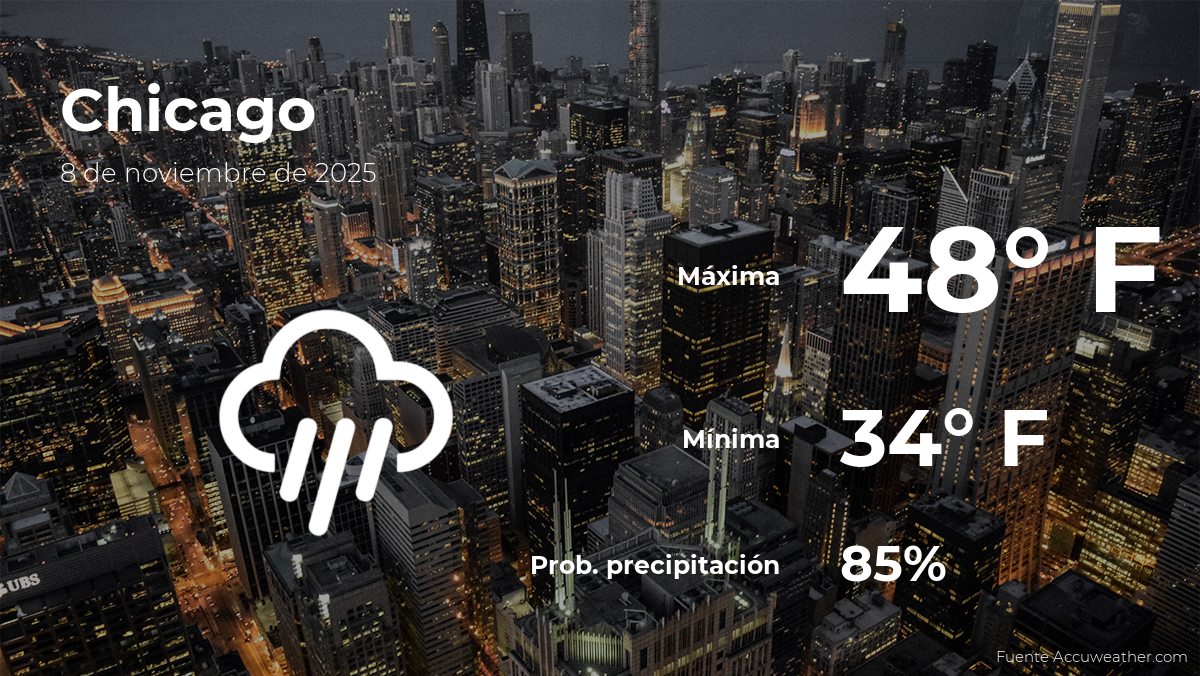 El pronóstico para hoy en Chicago indica una temperatura máxima de 48 grados Fahrenheit (9 ºC) y una mínima de 34 grados Fahrenheit (1 ºC). Asimismo, la sensación térmica —es decir, la “temperatura real”— se pronostica en 46 ºF (8 ºC) tanto de máxima como de mínima.