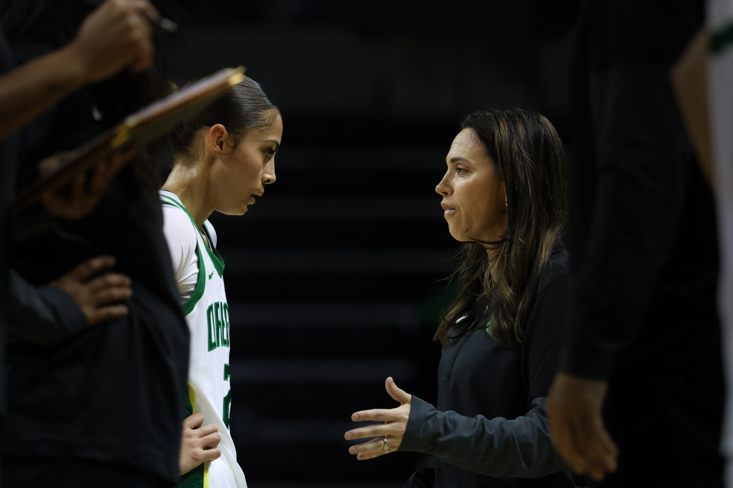 Katie Fiso (2) and Ducks associate head coach, Jodie Berry, converse during a second quarter timeout. The University of Oregon Ducks host the West Georgia Wolves in their home opener at Matthew Knight Arena in Eugene, Ore., on Nov. 3, 2025. (Julia Massa/Emerald)